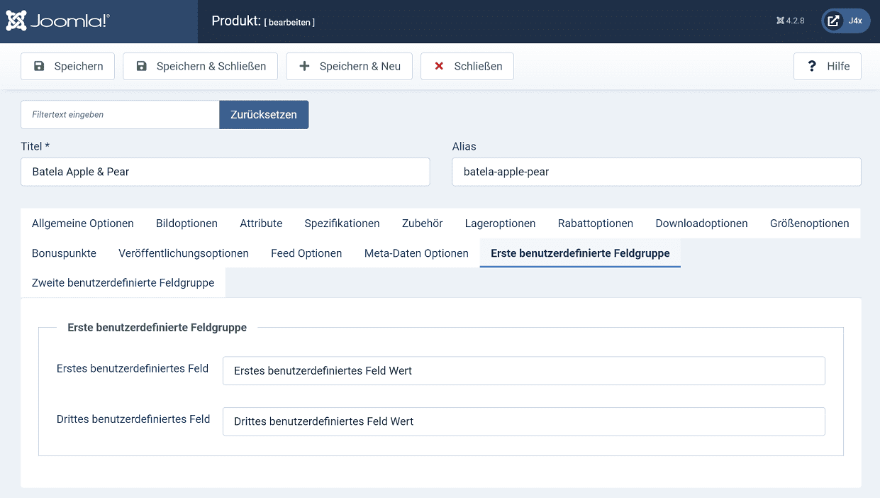 Wenn jemand an die Arbeit mit benutzerdefinierten Feldern in Joomla! gewöhnt ist, kann er sie auch in Phoca Cart verwenden. Benutzerdefinierte Felder können nicht gefiltert werden, da sie verschiedene Arten von Werten wie Beschreibung, Bild usw. enthalten können. Daher sind sie nützlich für die Anzeige von Werten für Produkte und für die Suche. Die Suche kann mit einem Parameter deaktiviert werden. Wenn also jemand keine benutzerdefinierten Felder verwendet, werden sie von Phoca Cart standardmäßig nicht in die Suche einbezogen. Benutzerdefinierte Felder können in Joomla! gruppiert werden. Die Standardansicht der benutzerdefinierten Felder im Produktdetail ist die Registerkartenansicht. Jede Gruppe hat also eine eigene Registerkarte. Es ist natürlich möglich, die Werte der benutzerdefinierten Felder an einer anderen Stelle anzuzeigen, indem man Overrides (Überschreiben der Ausgaben im Template) verwendet.